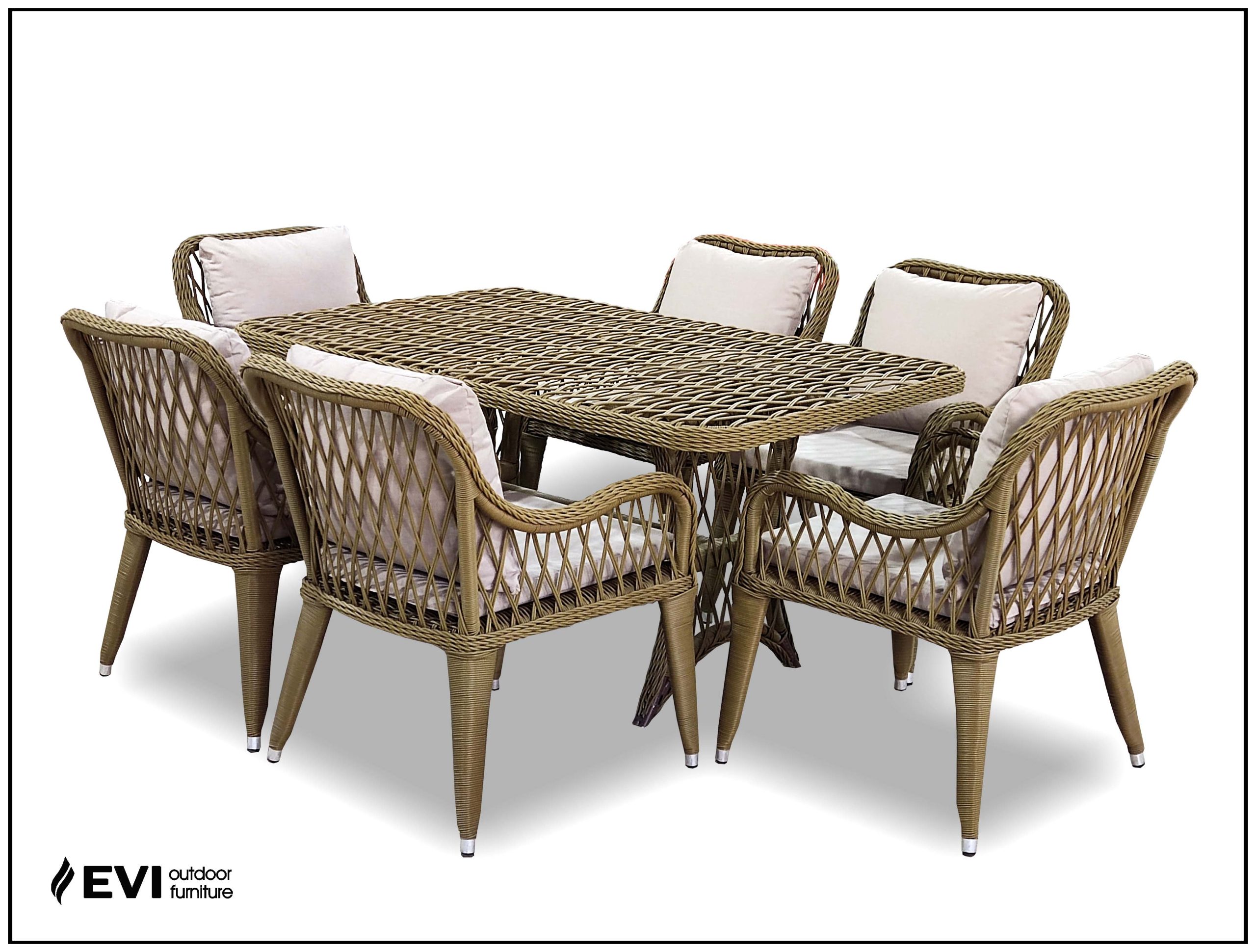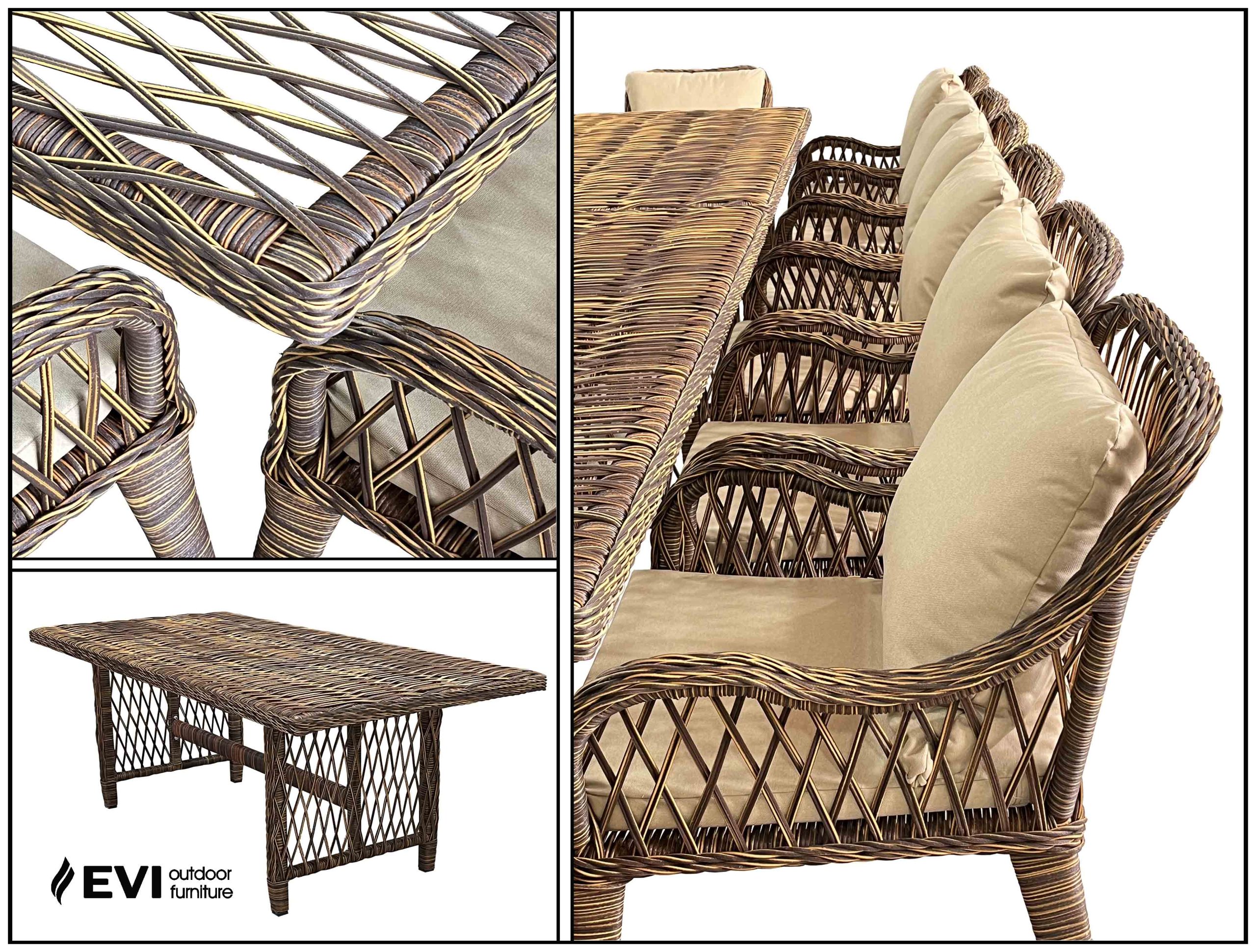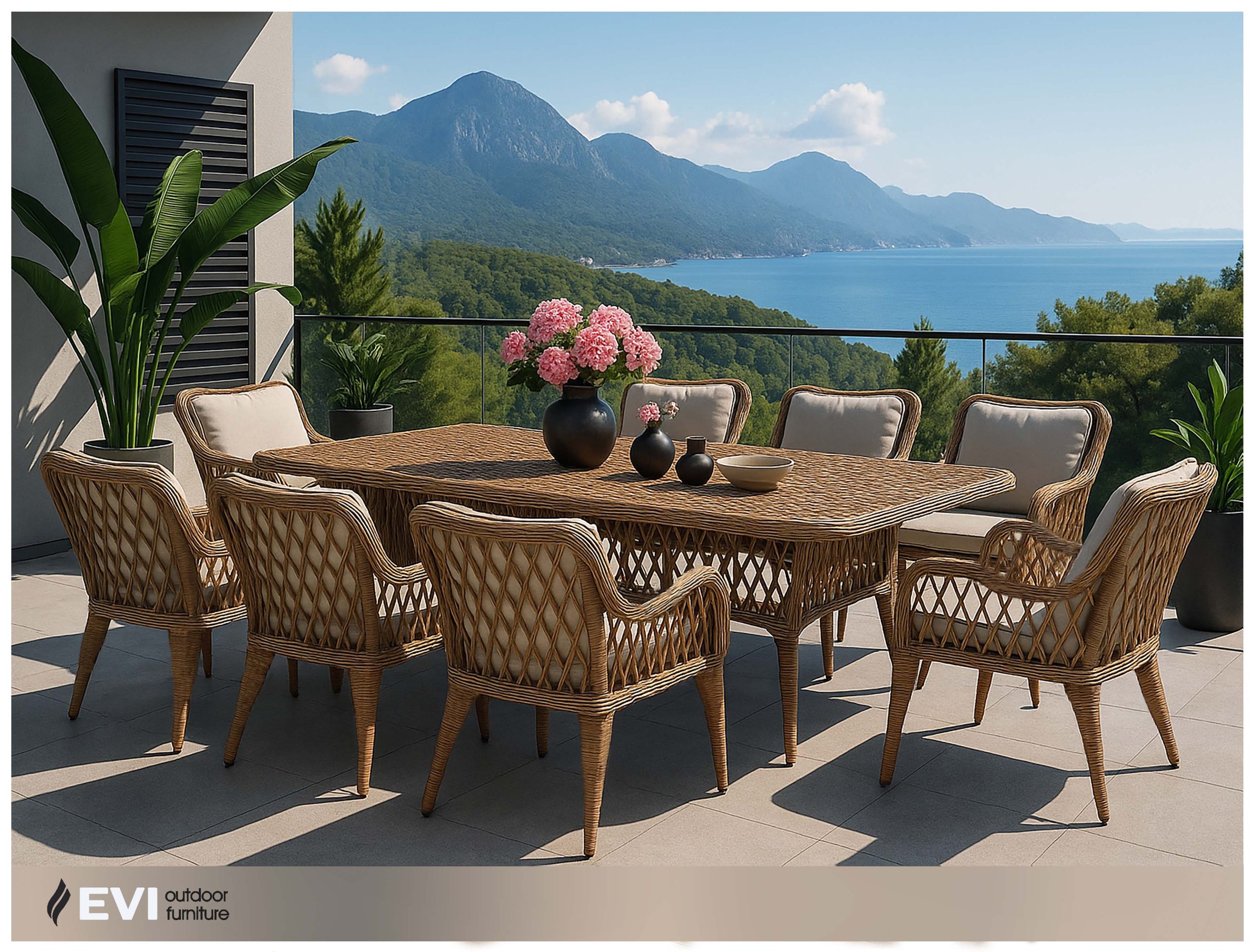 میز و صندلی فضای باز بستلی از برند اِوی EVI انتخابی ایدهآل برای لذت بردن از غذا، دورهمی و عصرانه در فضای باغ، تراس یا پاسیو است. این ست از جنس ترکیبی آلومینیوم سبک با رویه مقاوم رتان (حصیر پلیمری) دست بافت ساخته شده تا در برابر باران، رطوبت و تابش مستقیم آفتاب کاملاً دوام بیاورد.