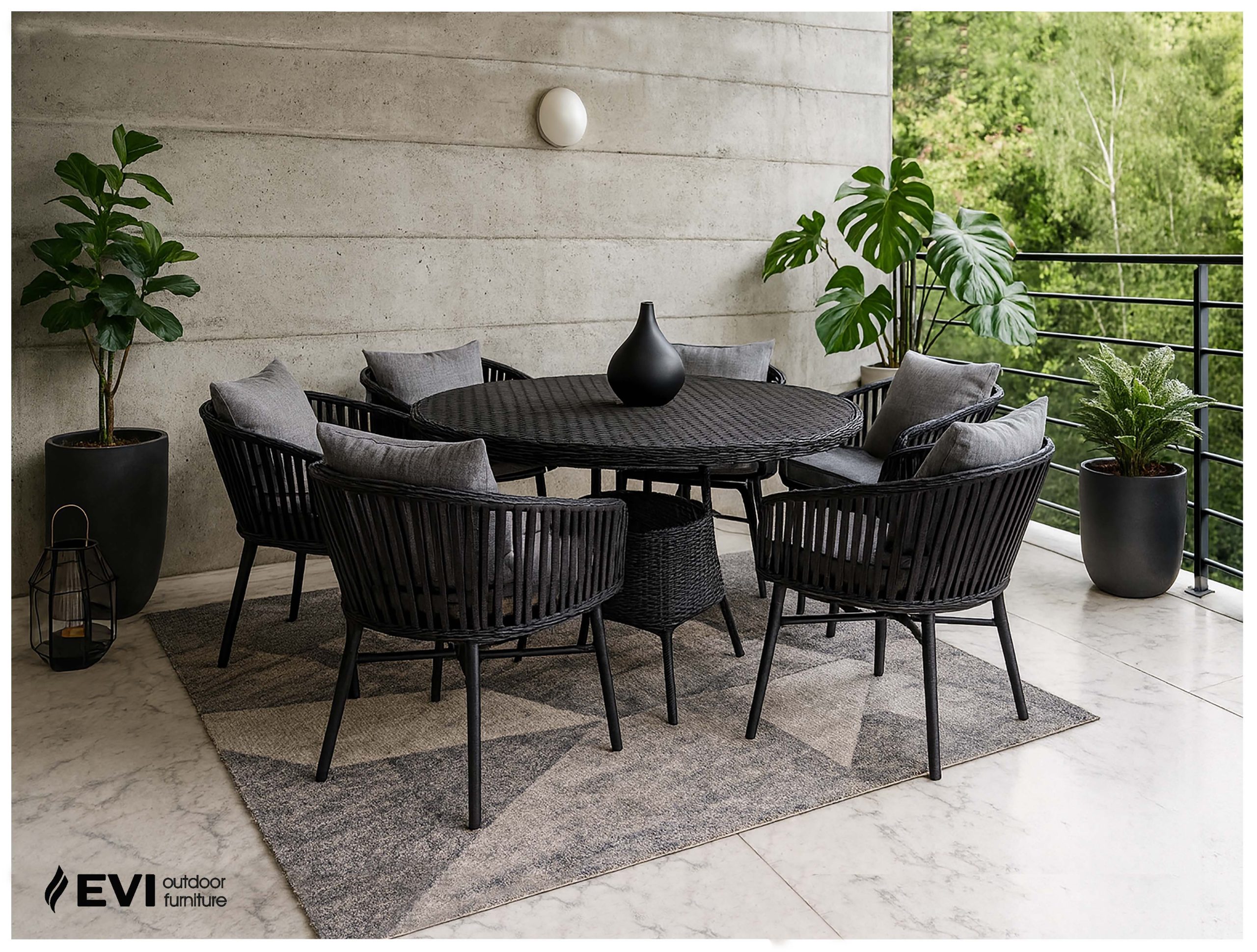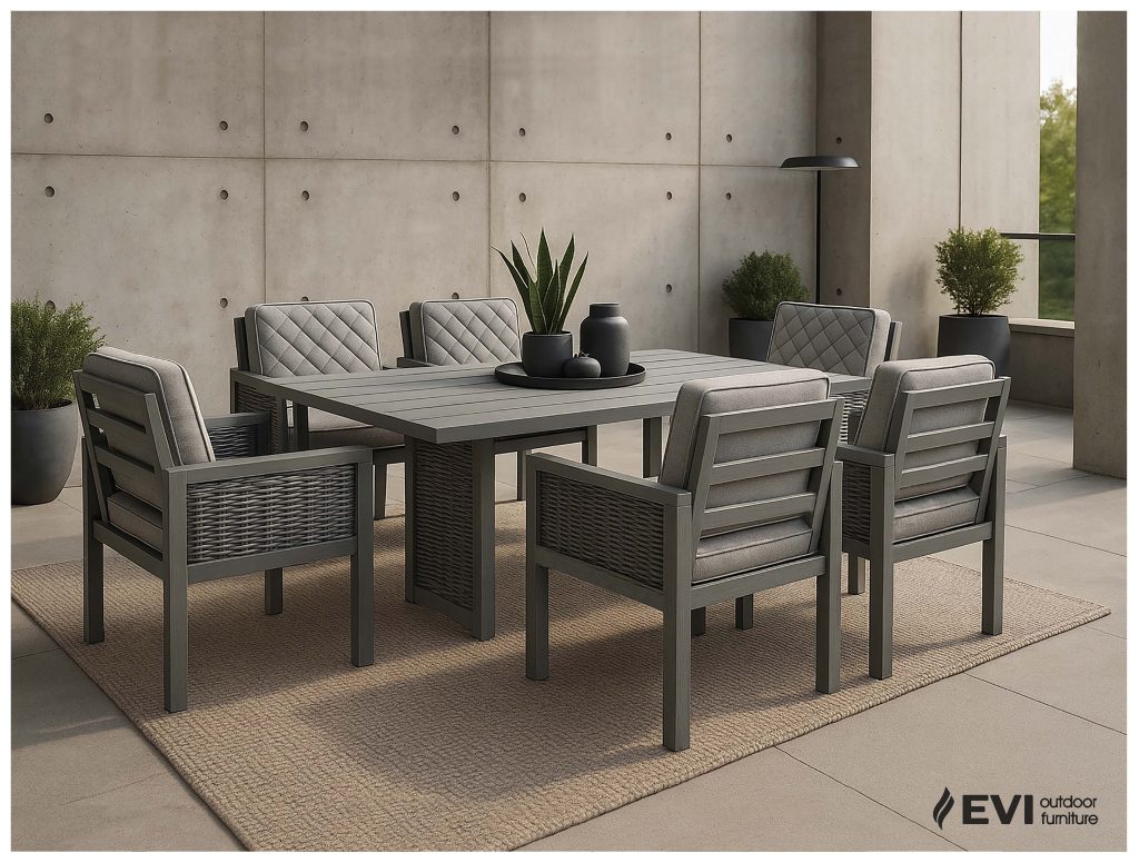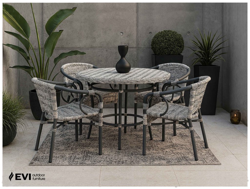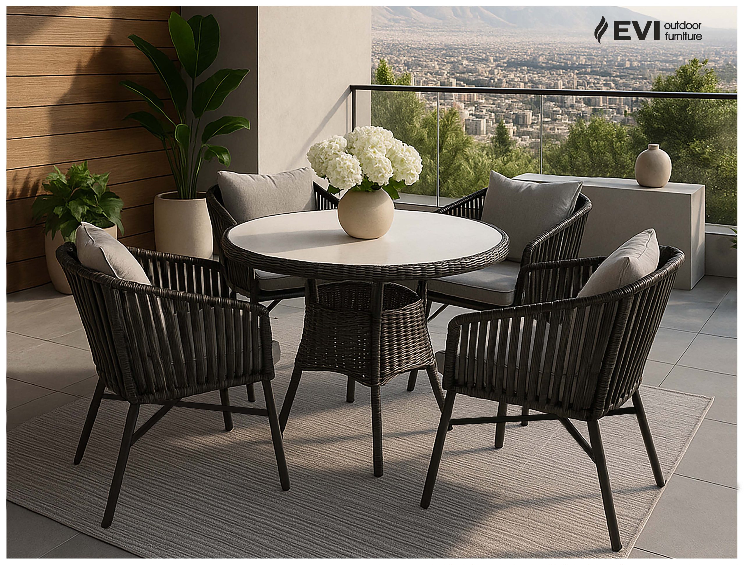 میز و صندلی فضای باز چری از برند اِوی EVI انتخابی ایدهآل برای لذت بردن از غذا، دورهمی و عصرانه در فضای باغ، تراس یا پاسیو است. این ست از جنس ترکیبی آلومینیوم سبک با رویه مقاوم رتان (حصیر پلیمری) دست بافت ساخته شده تا در برابر باران، رطوبت و تابش مستقیم آفتاب کاملاً دوام بیاورد.