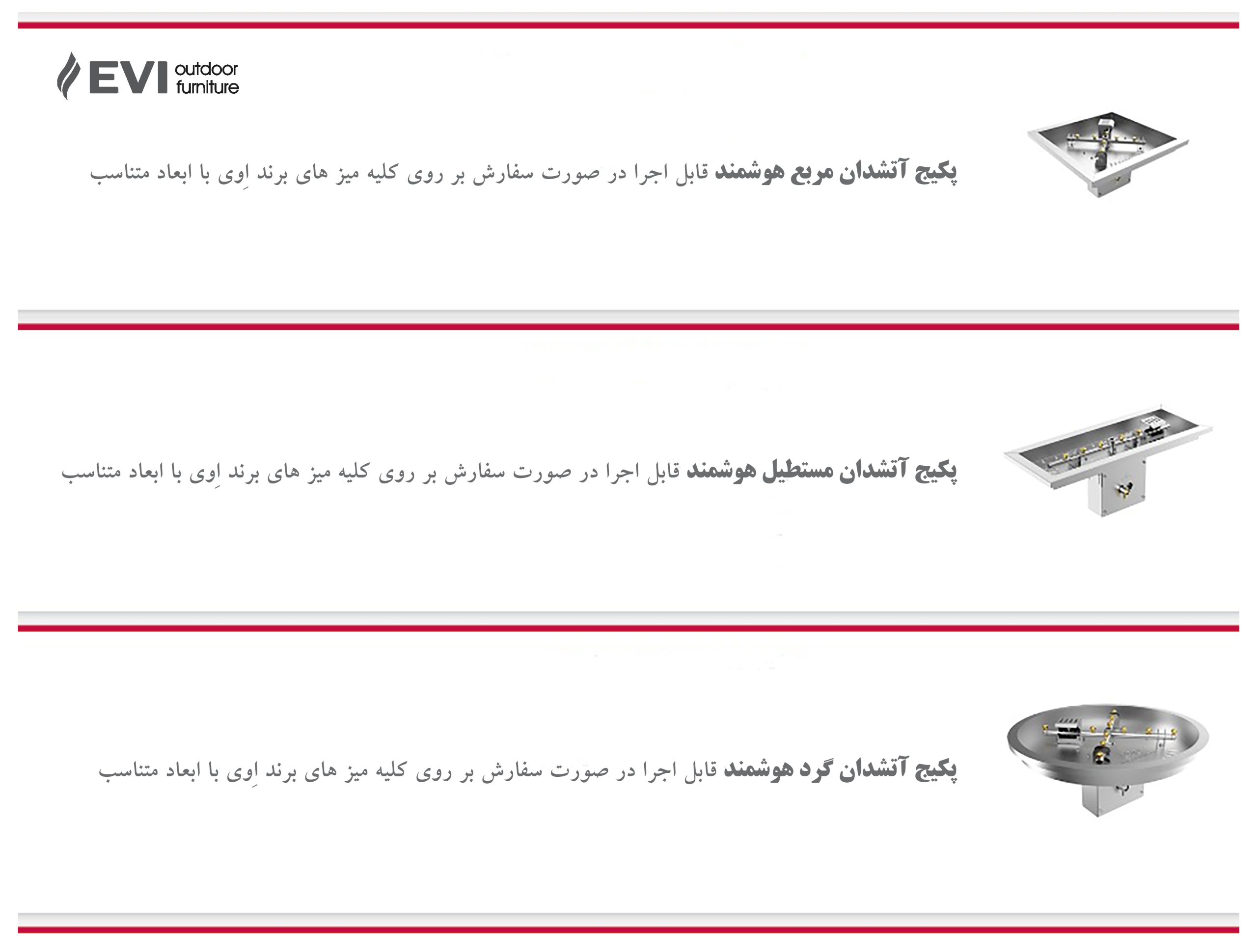 پکیج آتشدان تمام استیل هوشمند در اشکال مستطیل ، مربع و گرد قابل اجرا در صورت سفارش بر روی تمامی میز های تولیدی برند اِوی با ابعاد متناسب میباشد.